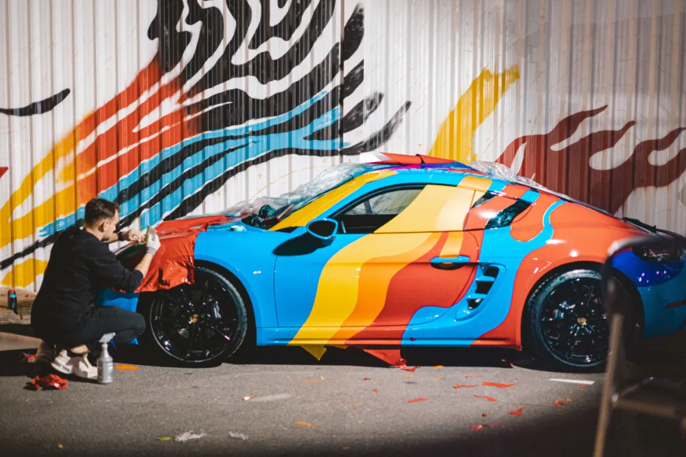 تعاونت شركة ديزرت دايموند ديتيلينغ سيرفيس مع الفنانة المعروفة عالمياً دينا سعدي وبورشه الشرق الأوسط لتطوير غلاف فني مخصص كامل لمنافسة كأس بورشه كاريرا. هذا ليس غلافاً قياسياً متغير اللون. إنه مشروع هوية بصرية جديدة كلياً: فقد ابتكرت دينا سعدي الفكرة، وقامت شركة ديزرت دايموند ديتيلينغ بتحويلها إلى فيلم على جميع الأسطح المنحنية للسيارة، بما في ذلك الأجنحة وفتحات التهوية والمصدات والأبواب. وقد تم تنفيذ كل هذه العناصر بشكل مثالي من حيث المحاذاة والحجم والشكل، بحيث لم تشوه العمل الفني الأصلي. وسيتم استخدام السيارة لإظهار ما يمكن أن تحققه علامة بورشه والفن المحلي معاً. وتتمتع بورشه الشرق الأوسط بمعايير عالية الجودة وتتعاون مع أفضل الاستوديوهات فقط.